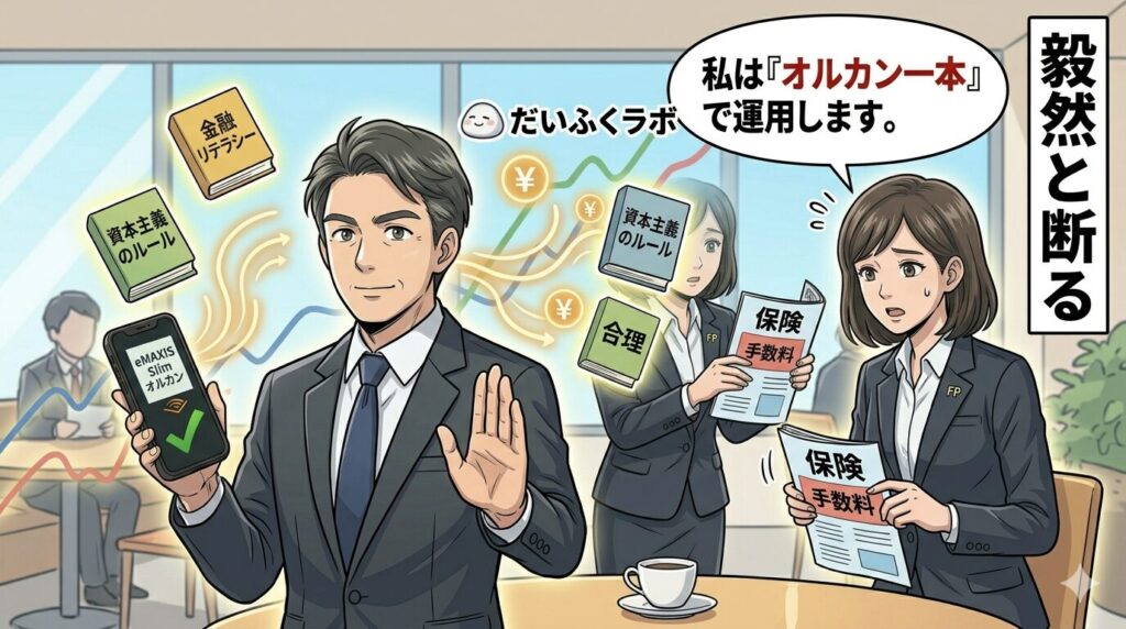 これでゲームセットです。 「資金の流動性」「オルカン」「新NISA」「インデックス運用」という専門用語を使い、「自力で運用する」と論理的に宣言した相手に対し、手数料の高いアクティブファンドや保険を無理やり押し売りできるFPはこの世に存在しません。